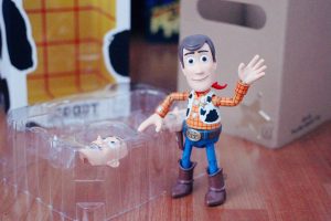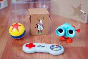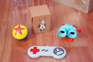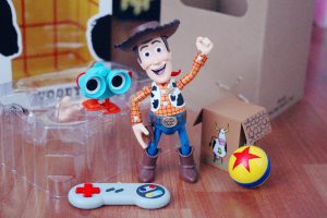 Woody comes with three different faces, all of which you can move the eyes into different position. He has four sets of hands in total, including some grippy ones for holding things; plus his hat of course! He also comes with a (plastic) box with a cow on (like the ones Andy drew buildings etc on in the first movie), the Luxo ball, a games console controller, and a little figure of Lenny. The different faces and hands etc are really easy to swap over and he poses really well. I am super impressed with him and can’t wait to take lots more photos of him!
