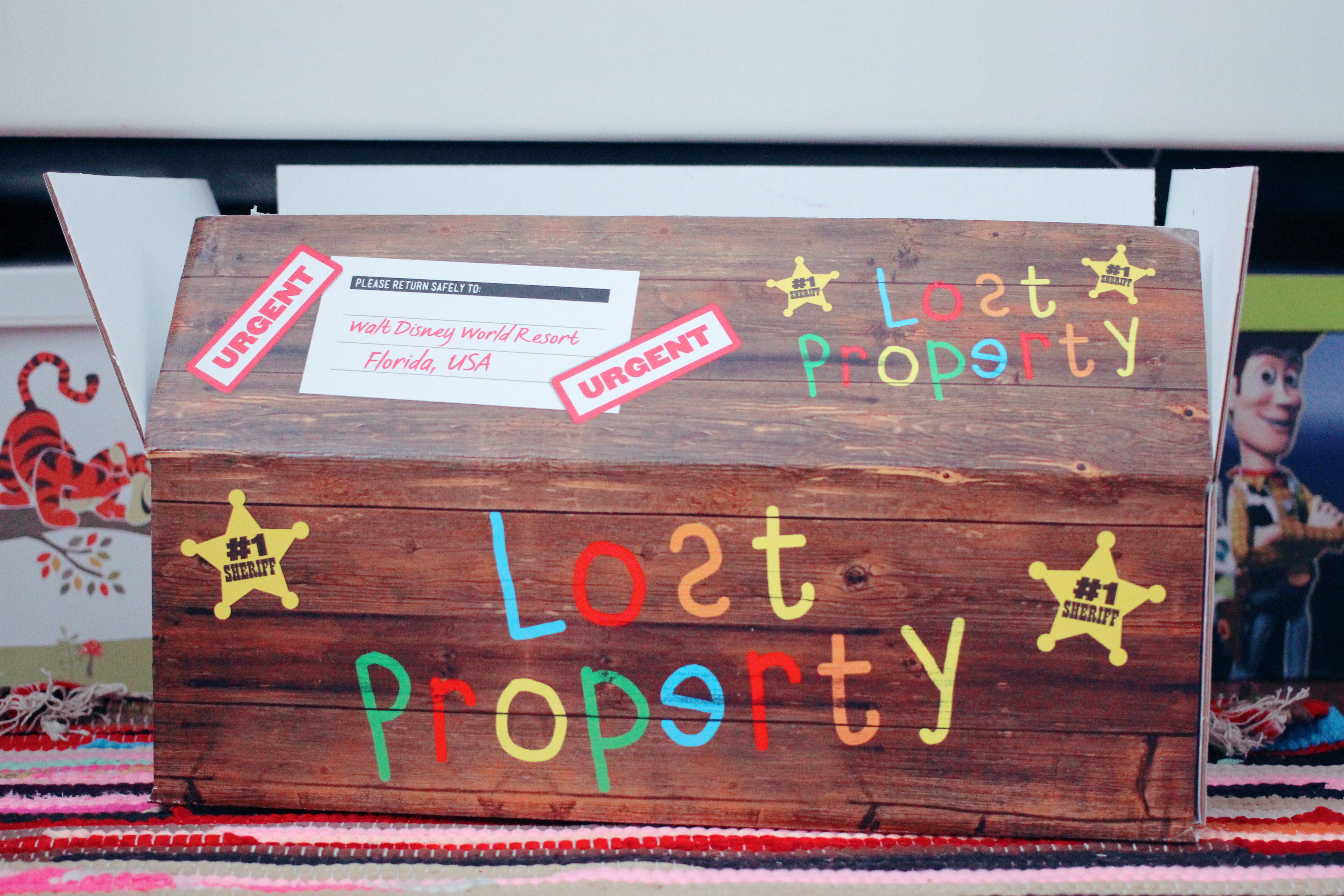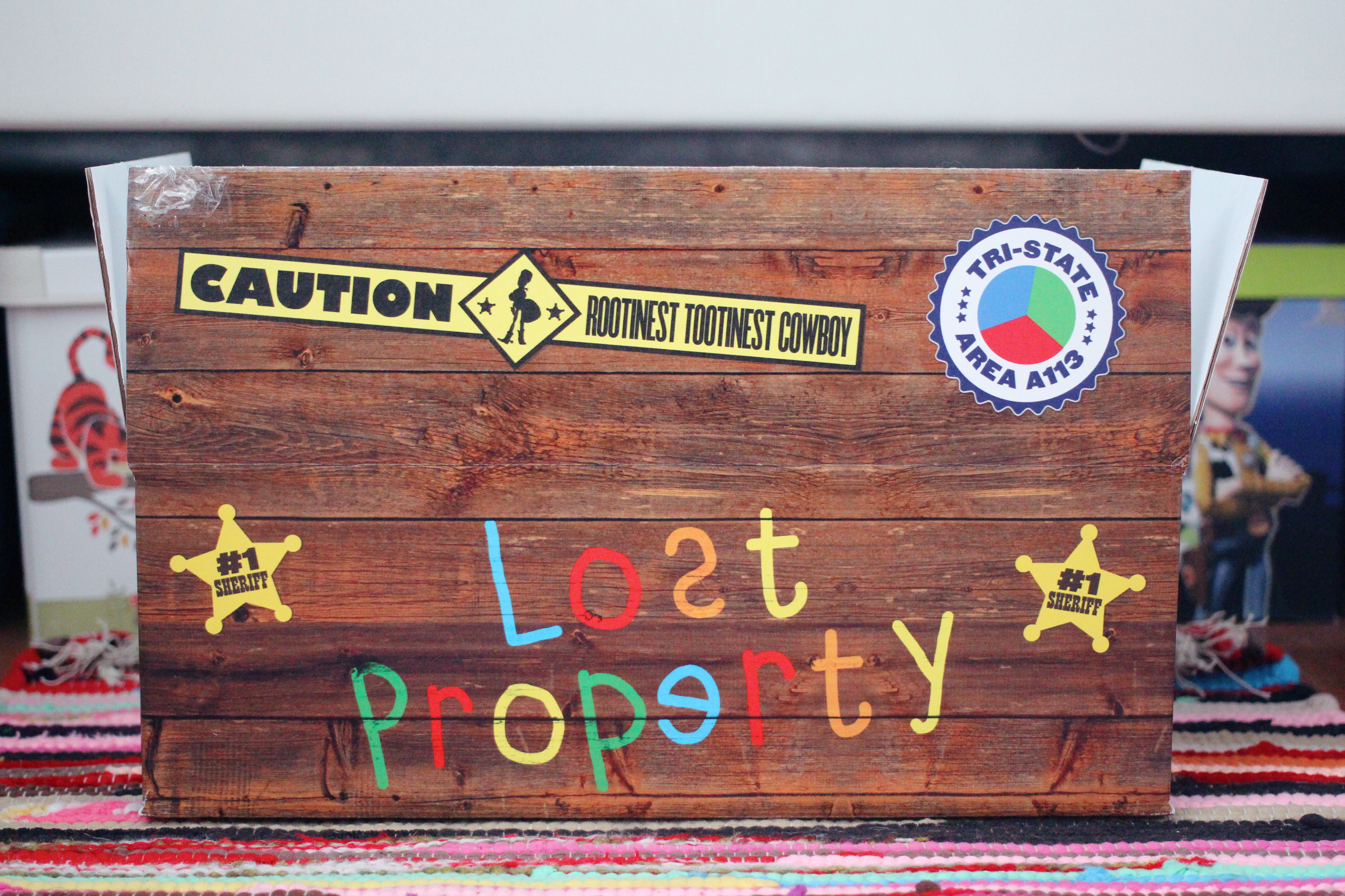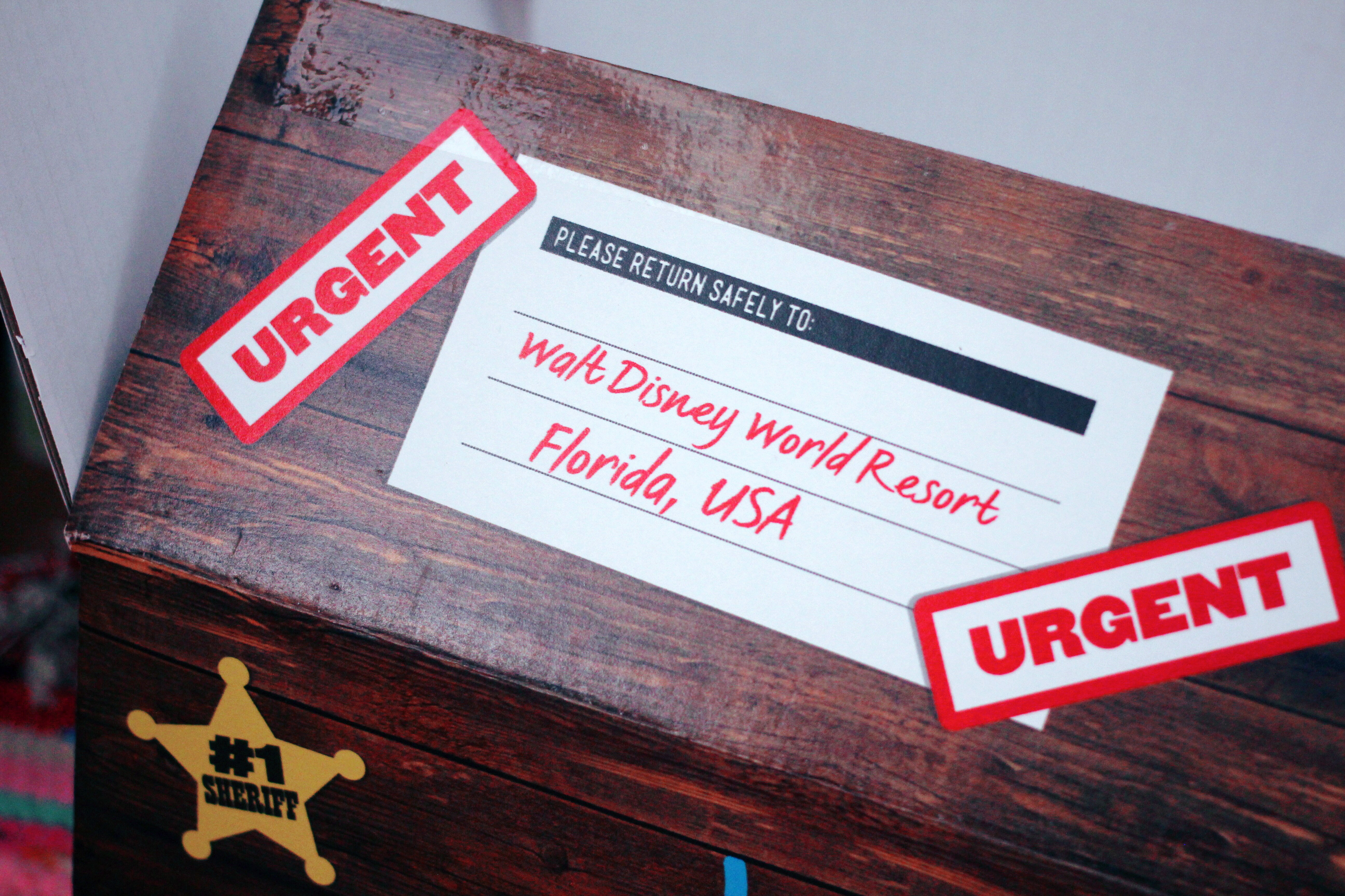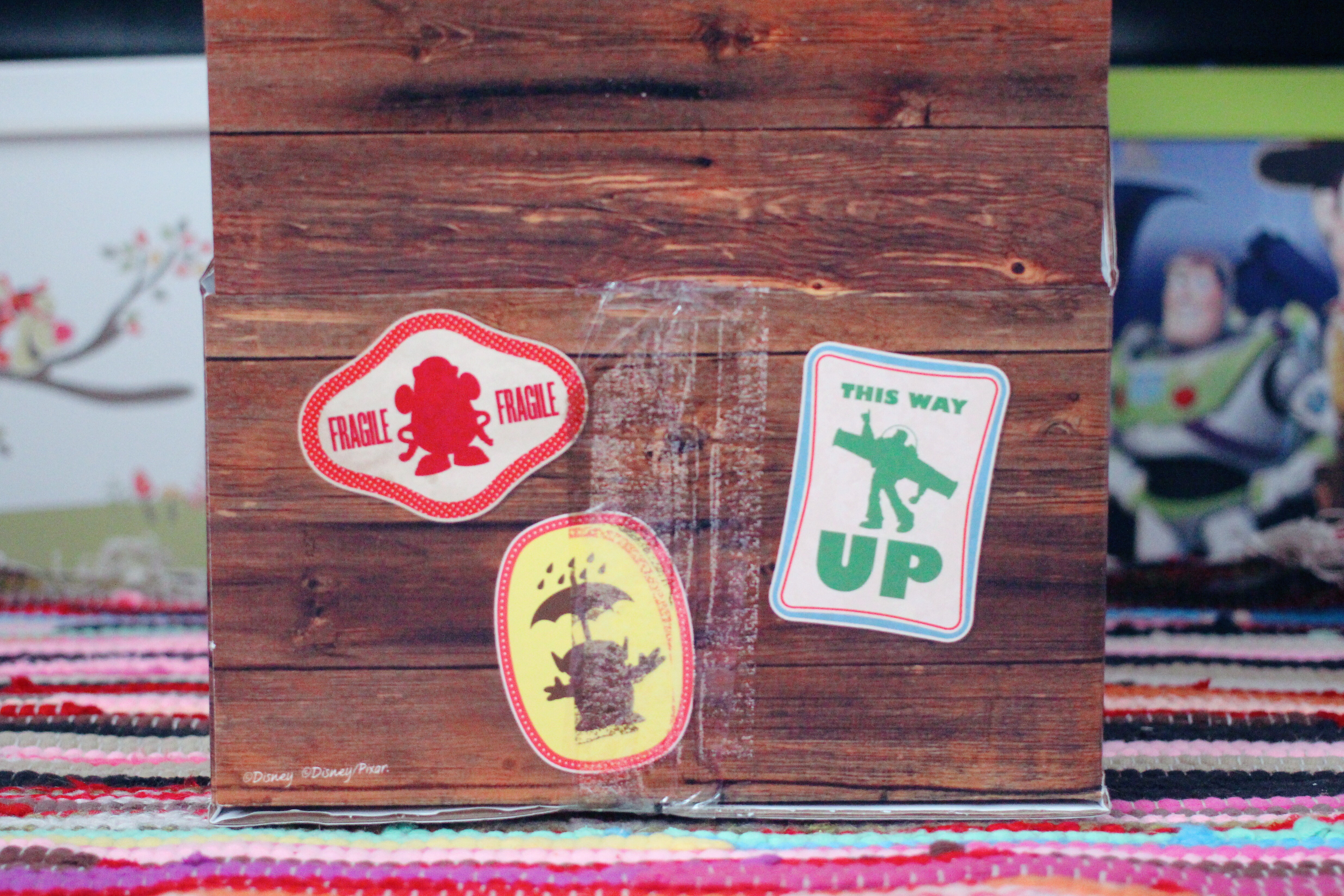The big draw of this Woody for me was his awesome box. He comes in a large cardboard box which is made to look a bit like a wooden crate. It has “Lost Property” written on the sides in colourful letters, some #1 Sheriff star badges, some “Urgent” stickers, a return address label with “Walt Disney World Resort” as the destination, as well as some other cute stickers with things such as “fragile” and “this way up” with silhouette graphics of other Toy Story characters on. On one side it has a large sticker (I am saying sticker by the way but they aren’t stuck on like stickers; they are part of the printed box design, they are just meant to look like stickers) that says “Caution – Rootinest Tootinest Cowboy” which is really cute, and one saying “Tri-State Area A113”. On the bottom there is one that says “Oops! I’m upside down!”.